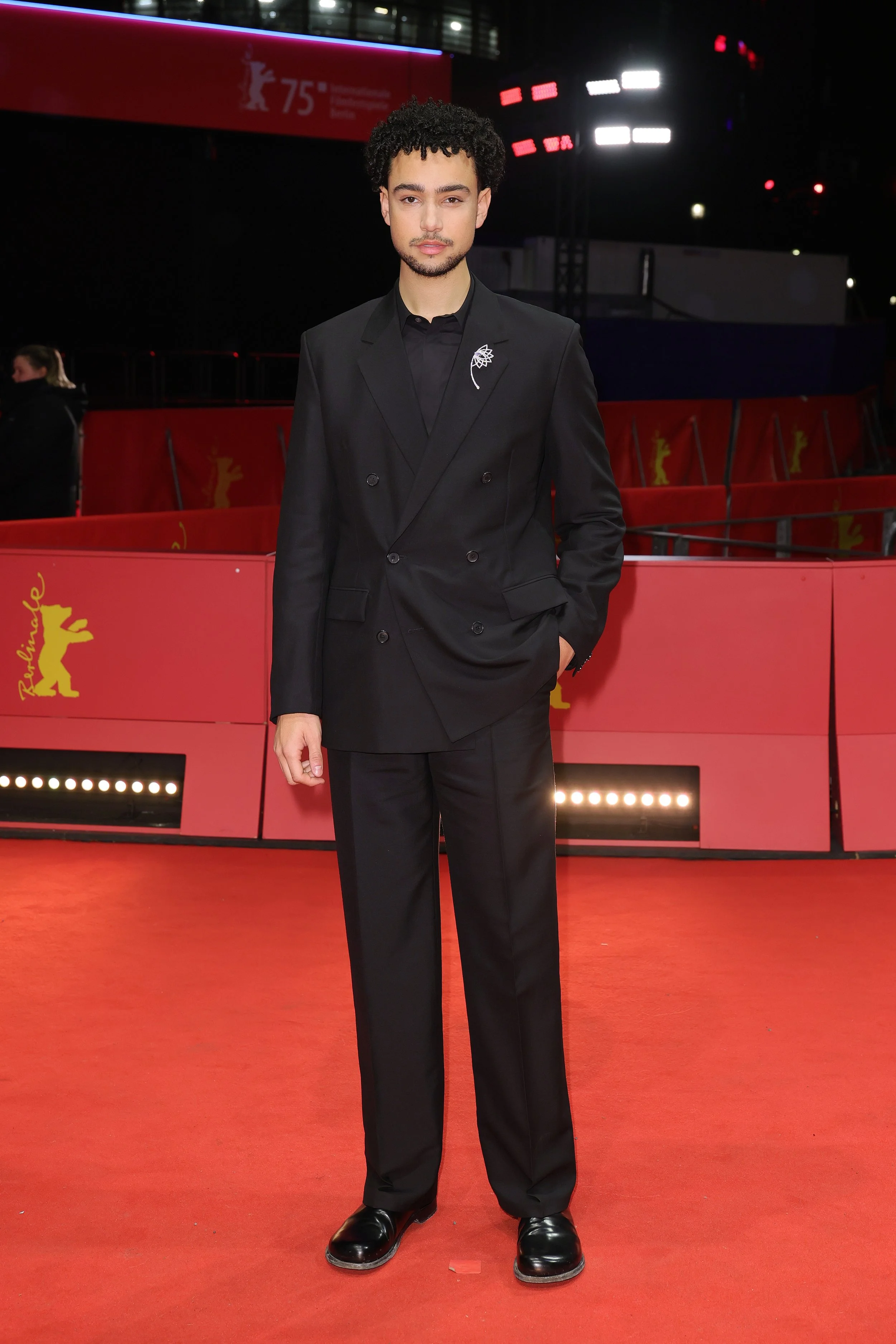 Archie Madekwe wears a LOEWE double-breasted wool suit with a classic shirt in cotton paired with a pair of Chelsea boots at the "Lurker" premiere during the 75th Berlinale International Film Festival Berlin on February 21st, 2025 in Berlin, Germany.
