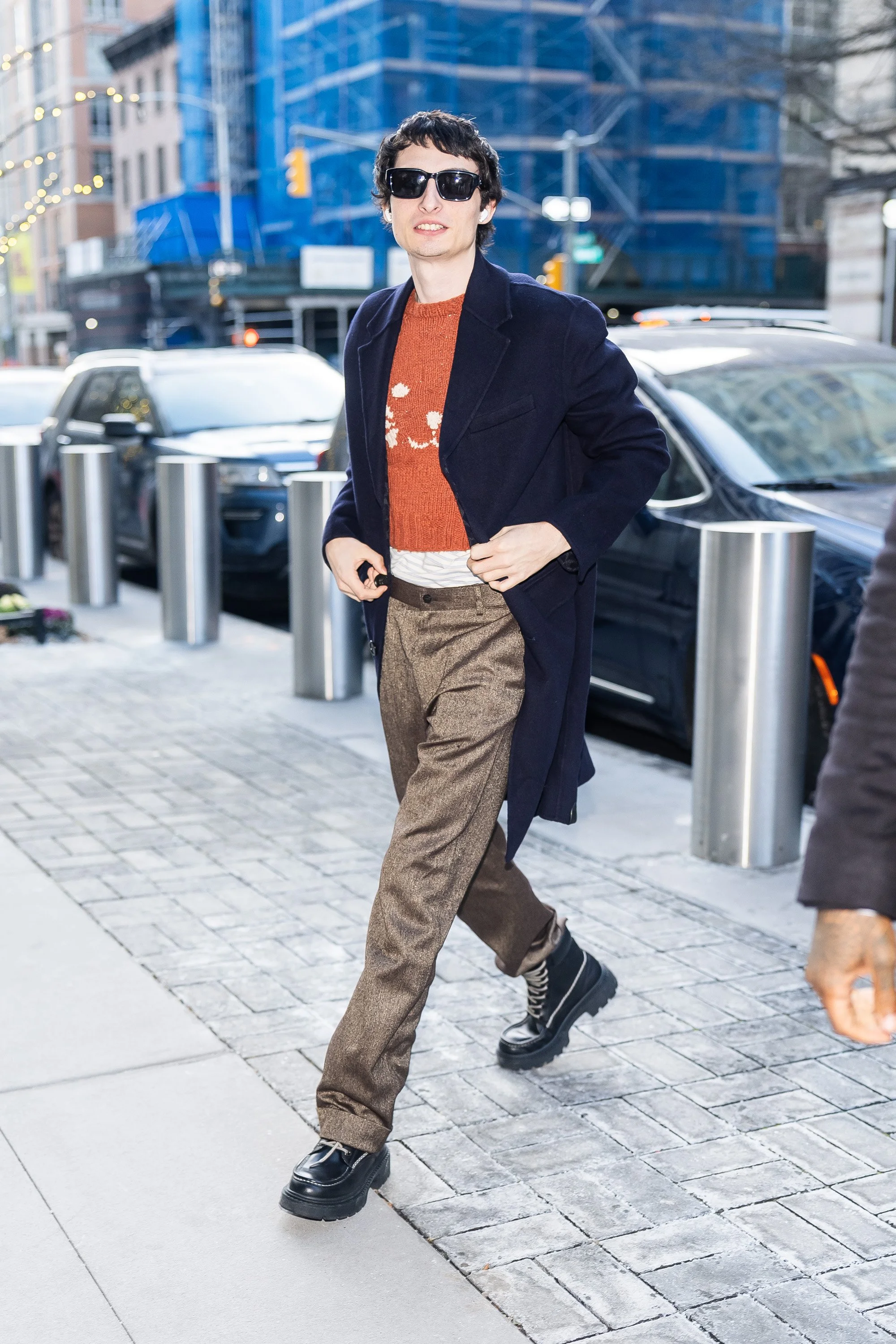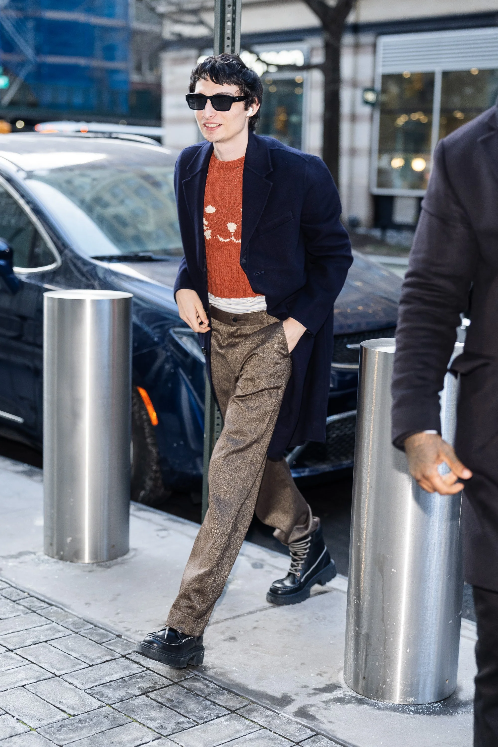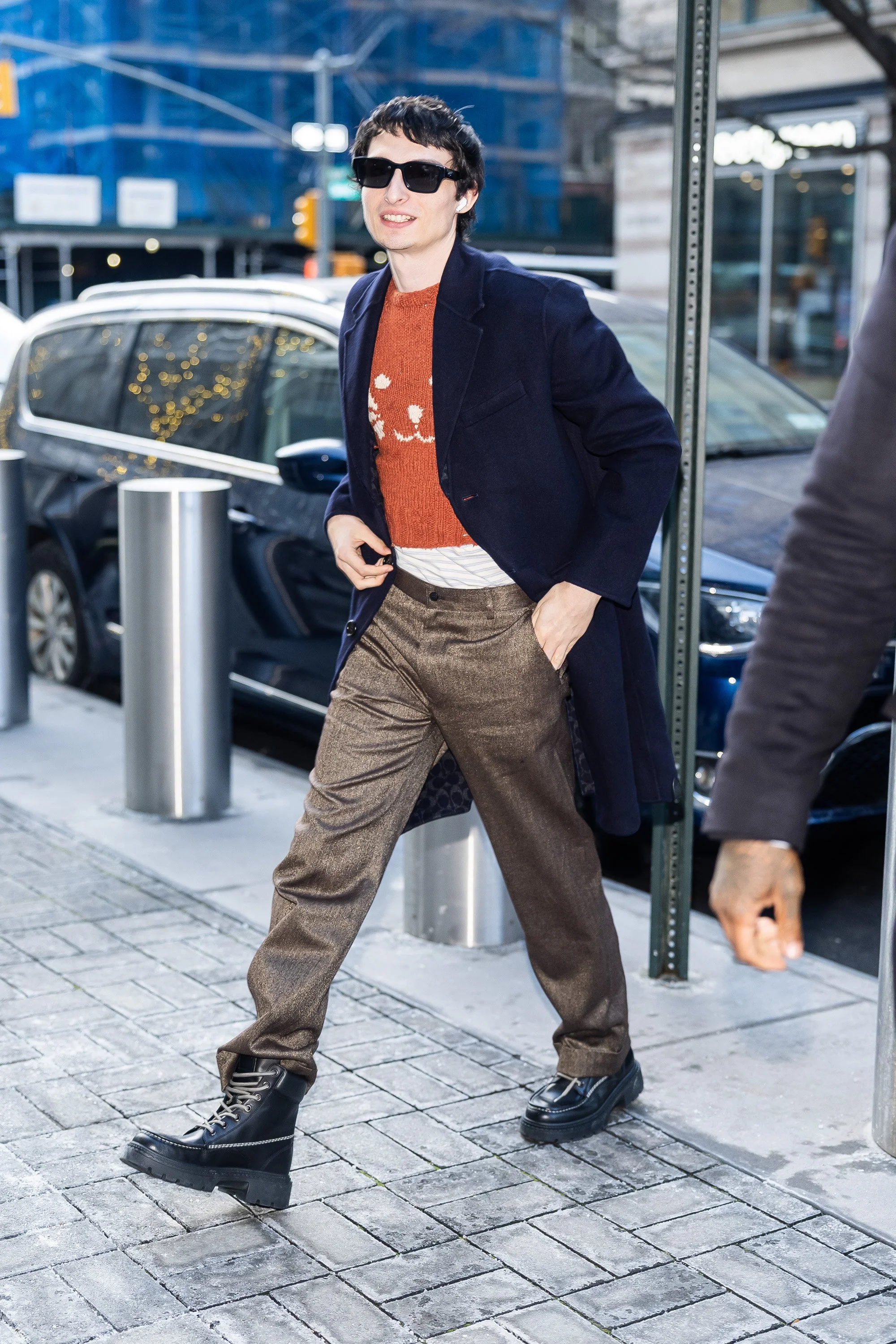 Actor Finn Wolfhard wears a Coach Spring 2026 animal face sweater, Double Faced Wool Coat, Maxi Sculpted C Narrow Square Sunglasses, and the Lug Sole Boot while doing press for Stranger Things.