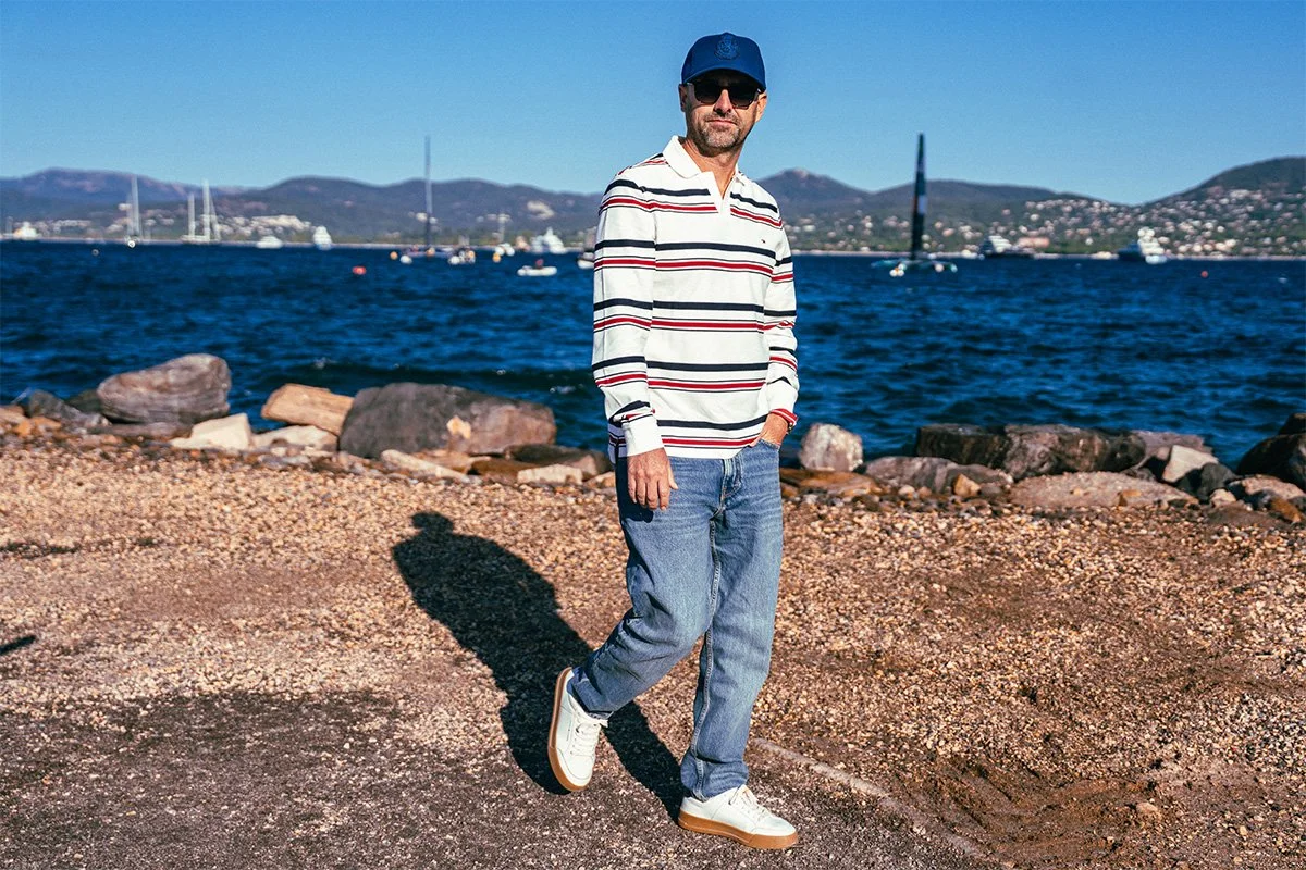 September 12th: Red, white and blue long-sleeved polo styled with relaxed denim jeans, white sneakers and a five-panel cap from the TOMMY HILFIGER Fall 2025 collection.
