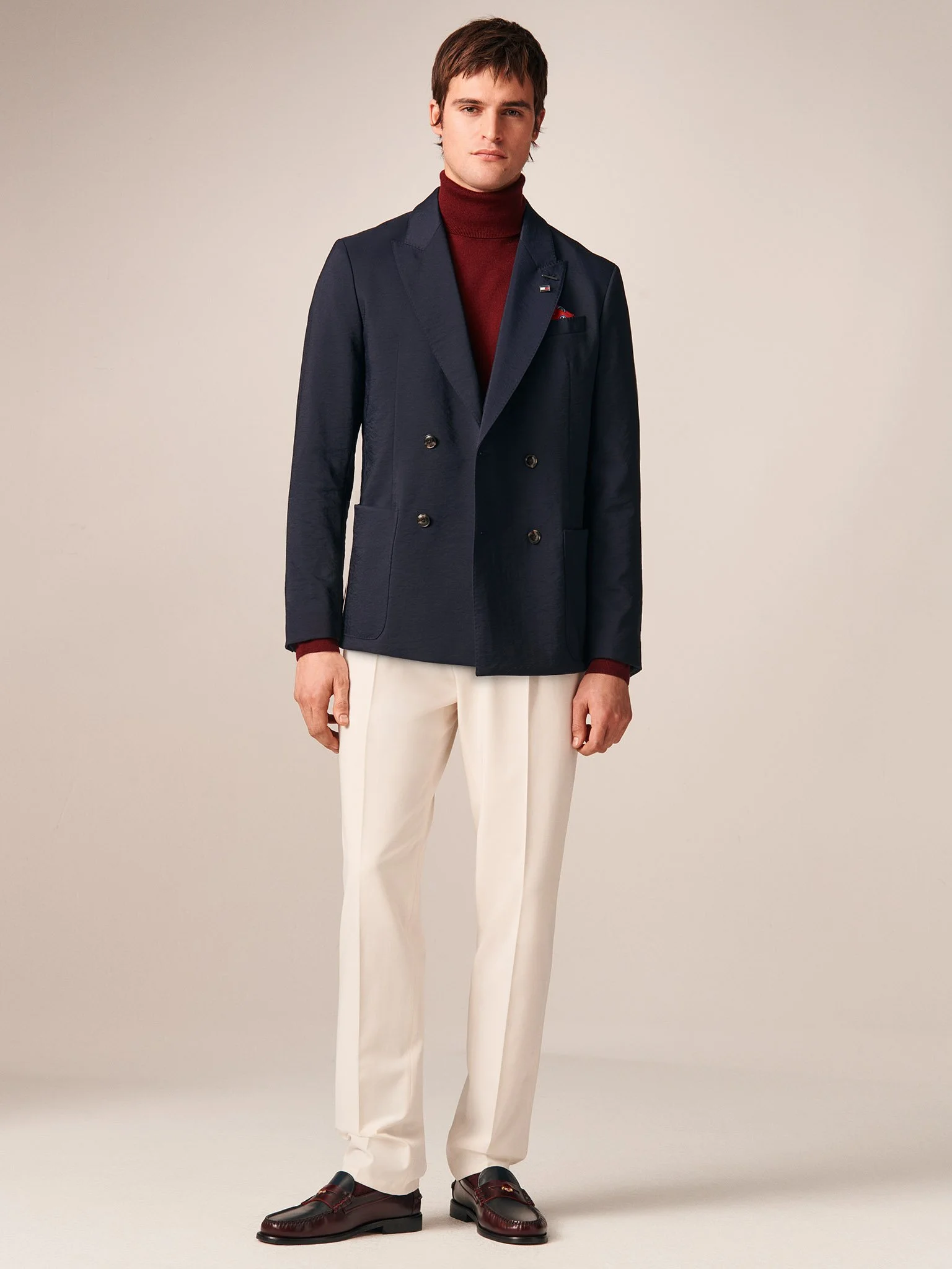 A silky wool-nylon blazer is layered over a burgundy merino rollneck, paired with crisp white stretch-satin trousers.