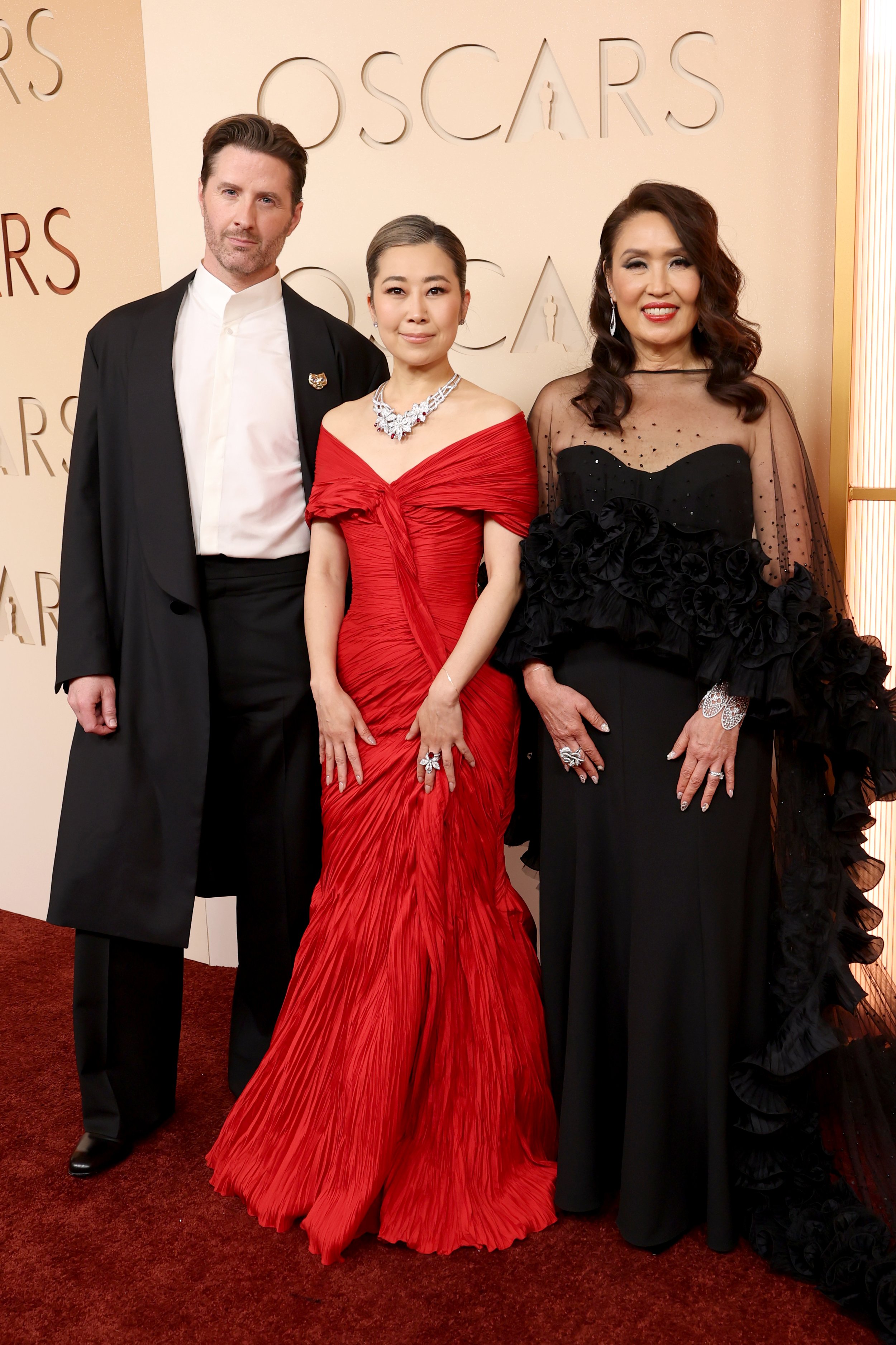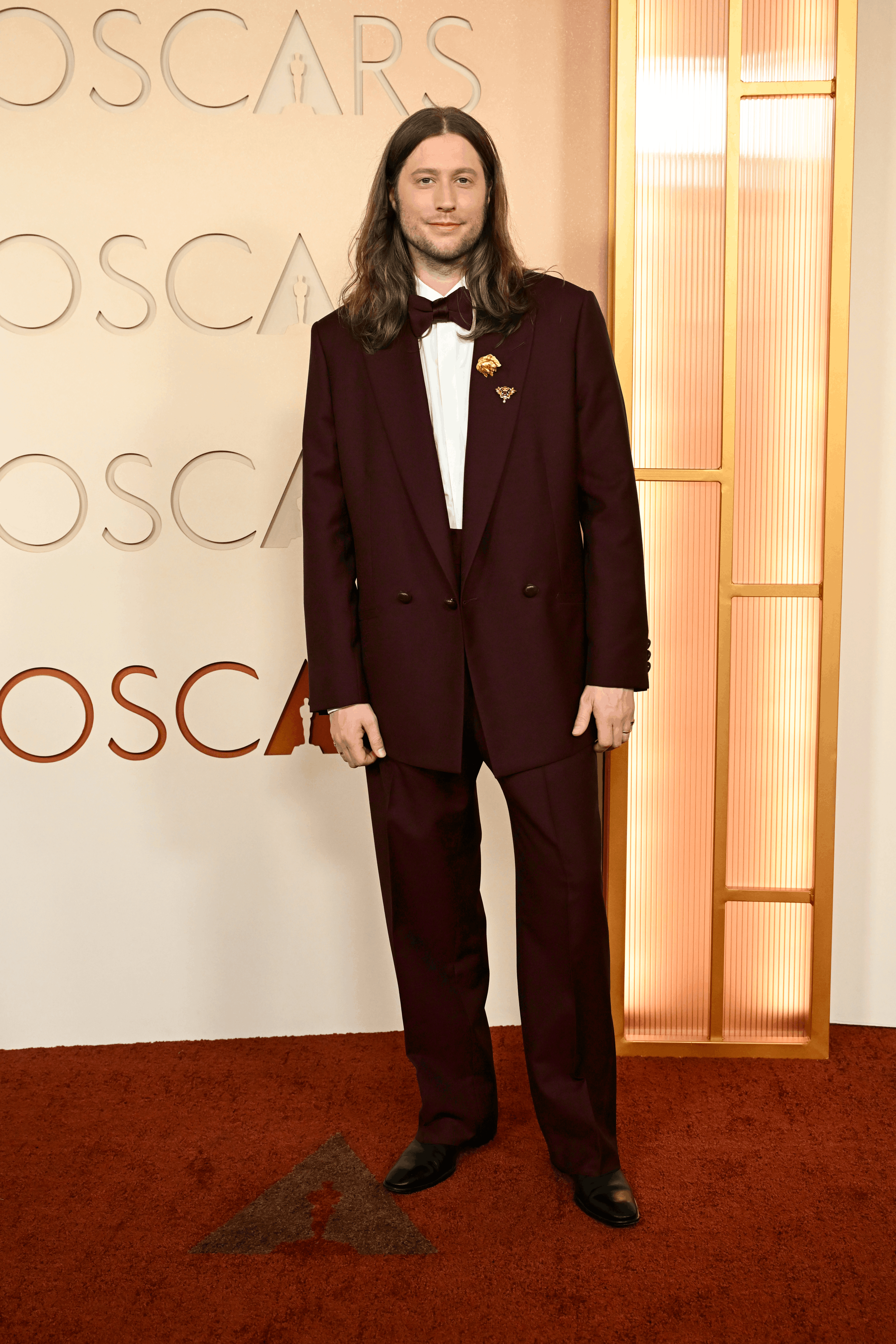 Ludwig Göransson wears a ZEGNA 2026 Fall/Winter Collection Burgundy peak lapel blazer, white silk shirt, burgundy wide leg trousers, burgundy bowtie, black Corso shoes at the Dolby Theatre.
