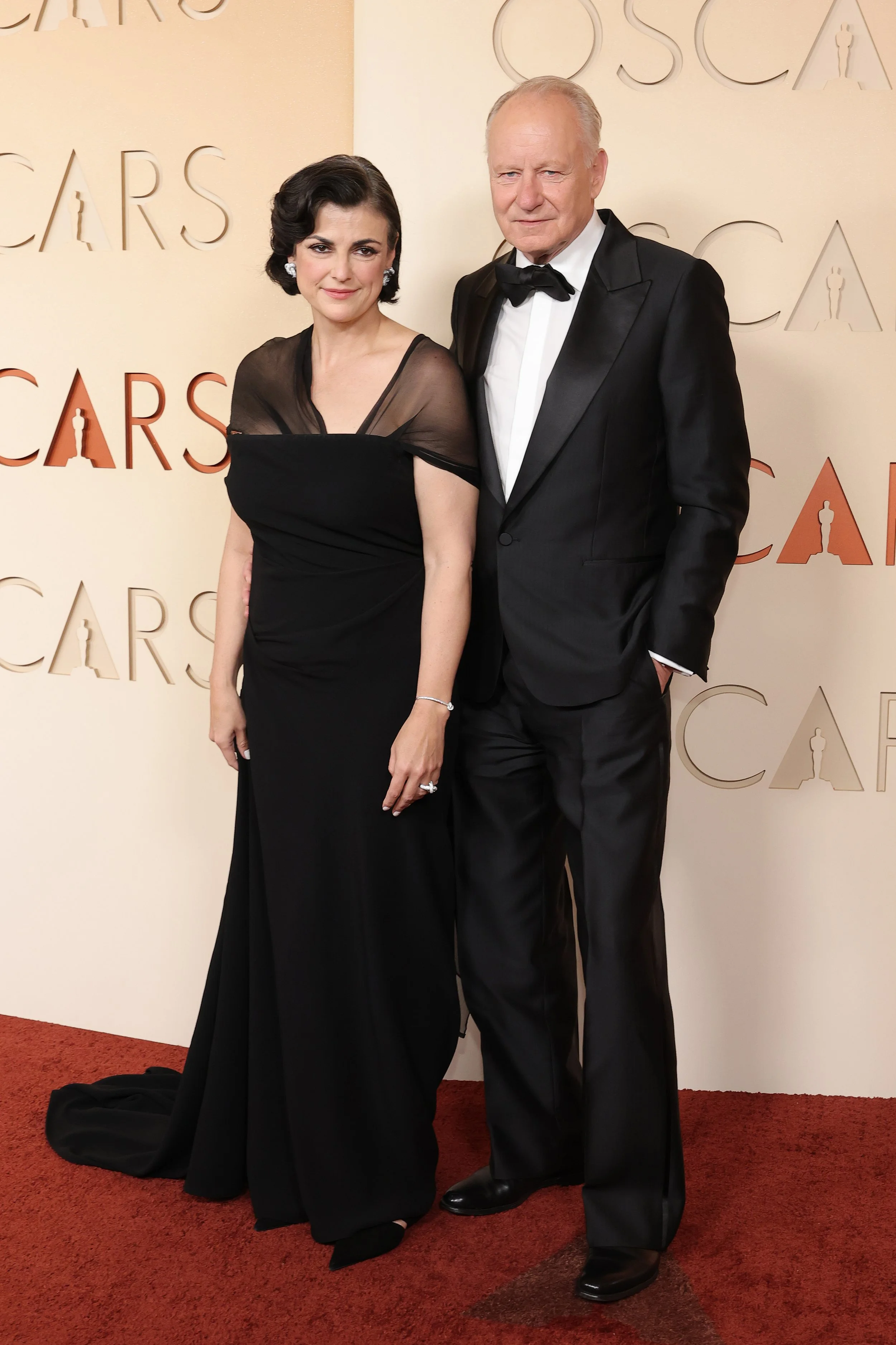 Stellan Skarsgård wears a ZEGNA 2026 Red Carpet Collection black peak lapel wool tuxedo with wide leg pants, white poplin covered buttons shirt, black silk bowtie and black Gala slip-on shoes at the Dolby Theatre.