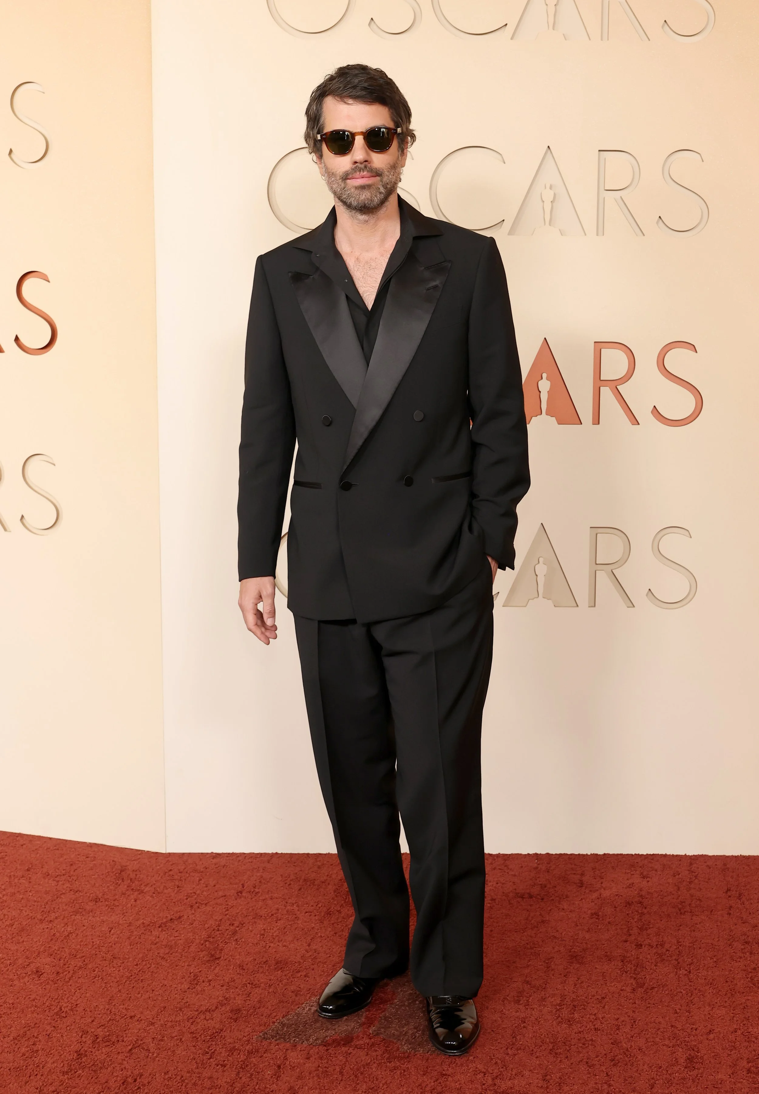 Adolpho Veloso wears a ZEGNA 2026 Red Carpet Collection black wool peak lapel double-breasted jacket, black wool wide leg pants, black poplin covered buttons shirt and black Vienna Evening shoes at the Dolby Theatre.