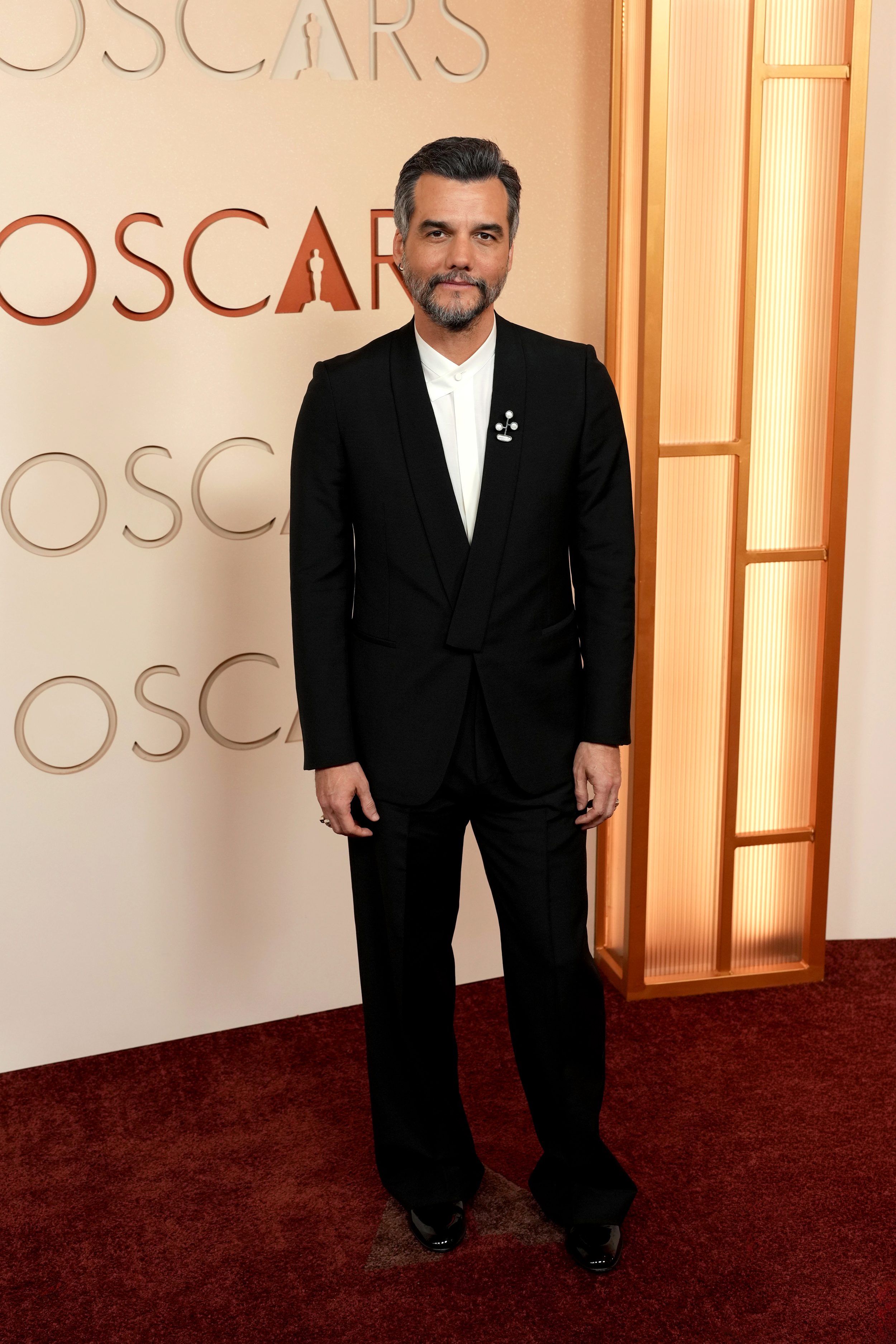 Wagner Moura wears a ZEGNA Red Carpet Collection black wool kimono blazer, black wool wide pants, white silk tab-collar shirt and black Gala slip-on shoes at the Dolby Theatre.